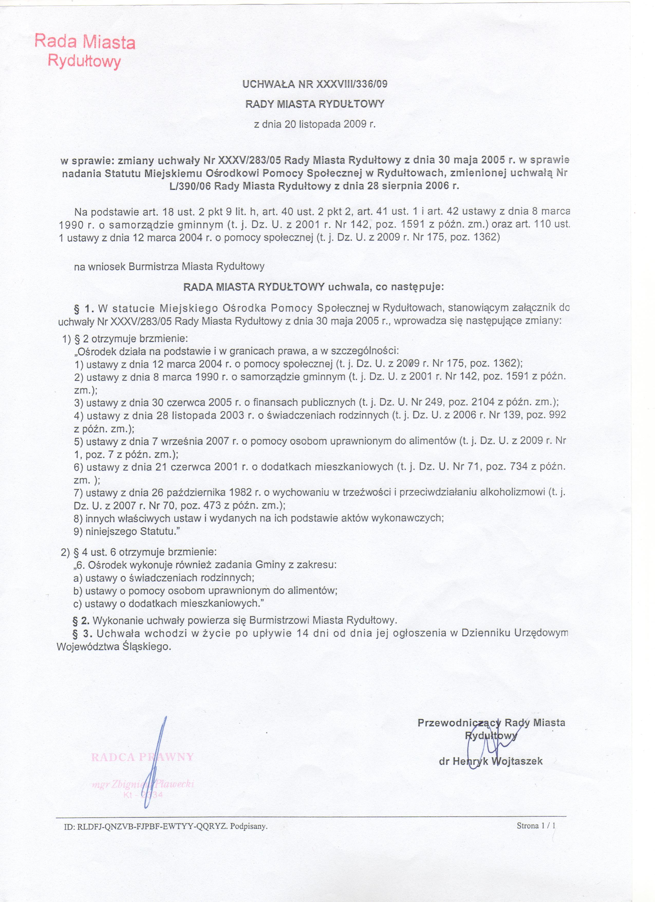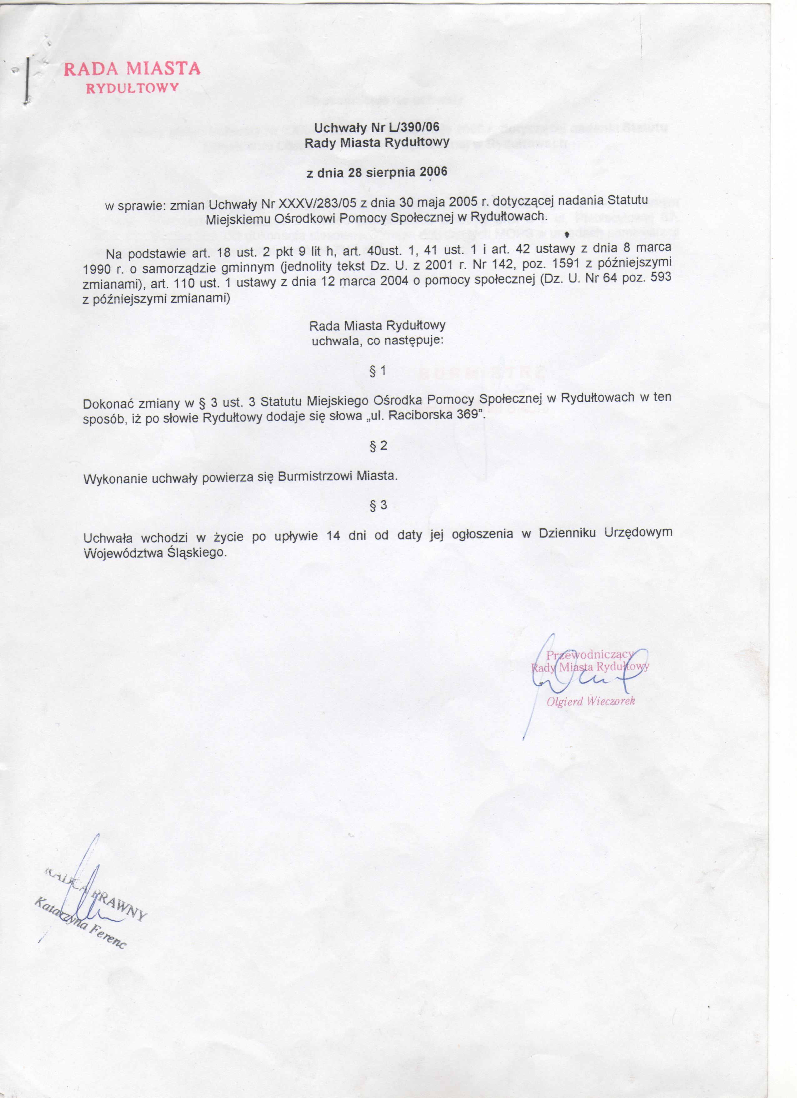 1. Statut Ośrodka jest nadawany przez Radę Miasta Rydułtowy.